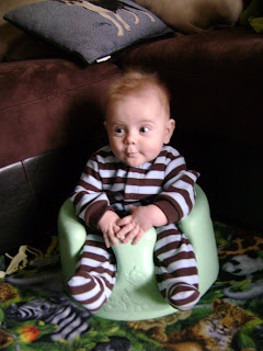 Cohen is weighing in at 17 pounds now. He is 6 months old, has 2 teeth on the bottom and the top two are on their way. He was a penguin for Halloween. He can roll all over the place on the floor. He is trying to learn to sit up, but often topples over because he is so round. His favorite toy is his blue bear blankie that Grammy Ruth gave him. He also loves his monkey and white blankie that Aunt Joan made him. We started him on rice cereal about two weeks ago. He loves the spoon. Of course he is a good eater. I hope it continues. :)